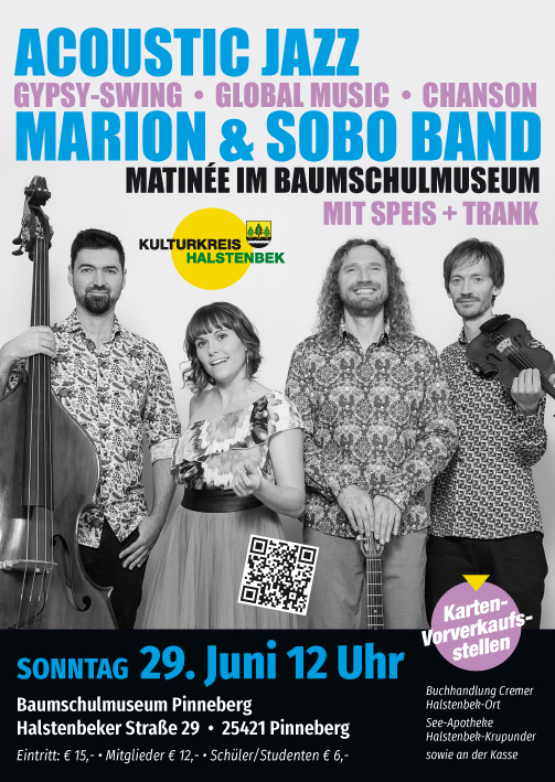 Geboren aus der Begeisterung für das Reisen und Sprachen, erschafft das französisch-deutsch-polnische Ensemble seinen eigenen modernen Stil aus vokalem Gypsy Jazz, globaler Musik und Chanson. Marion & Sobo Band singt und spielt mit viel Charme, Humor, Leichtigkeit und Spielfreude für ein kultur- und generationsübergreifendes Publikum. Sobo mit seiner Django Reinhardt-Gitarre, Geiger Frank Brempel und Kontrabassist Stefan Berger sorgen für hochenergetischen Swing!