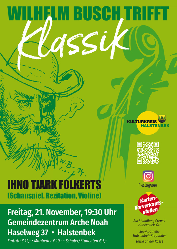 Ein heiterer Abend mit dem Geiger, Schauspieler und Rezitator Ihno Tjark Folkerts. I. T. Folkerts präsentiert uns Wilhelm Busch nicht nur als Verfasser weltberühmter Bildergeschichten, sondern auch als Maler, Zeichner und Philosophen. Musikalisch begleitet I. T. Folkerts diesen Abend mit Musik von Bach bis Saint-Saens. Eine wunderbare Verbindung von Schauspiel, Lesung und Musik – doppelter Genuß!